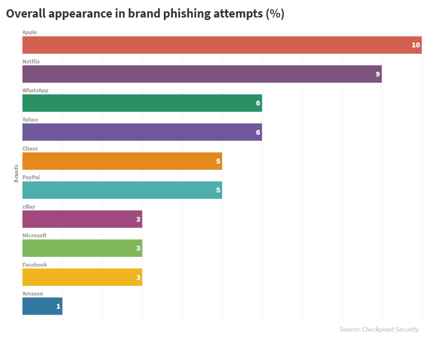 Konuya ilişkin olarak siber güvenlik firması Checkpoint’in 2020’nin ilk çeyreği gözetilerek yaptığı araştırmada, Apple’ın oltalama saldırılarında siber korsanlar tarafından en çok kullanılan marka olduğunu ortaya koyuyor. Apple’ı Netflix, Yahoo ve WhatsApp takip ediyor. Araştırmacılara göre Apple’ın tüm dünyada ilgi uyandıran yeni ürünlerine olan heyecan siber korsanların saldırılarını avantajlı hale getiriyor.