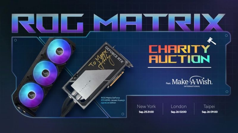 ROG Matrix GeForce RTX™ 4090’ın piyasaya çıkışını kutlamak isteyen ASUS Republic of Gamers (ROG), Make-A-Wish® International ile iş birliği yaparak NVIDIA CEO’su tarafından imzalanmış bir Matrix GeForce RTX 4090 ekran kartını açık artırmaya çıkardı. Açık artırmaya katılanlar PC oyunculuğu tarihine geçecek bu benzersiz parçayı alabilmek ve dünyanın her yerinden hasta çocukların dileklerini yerine getirebilmek için birbiriyle yarıştı.