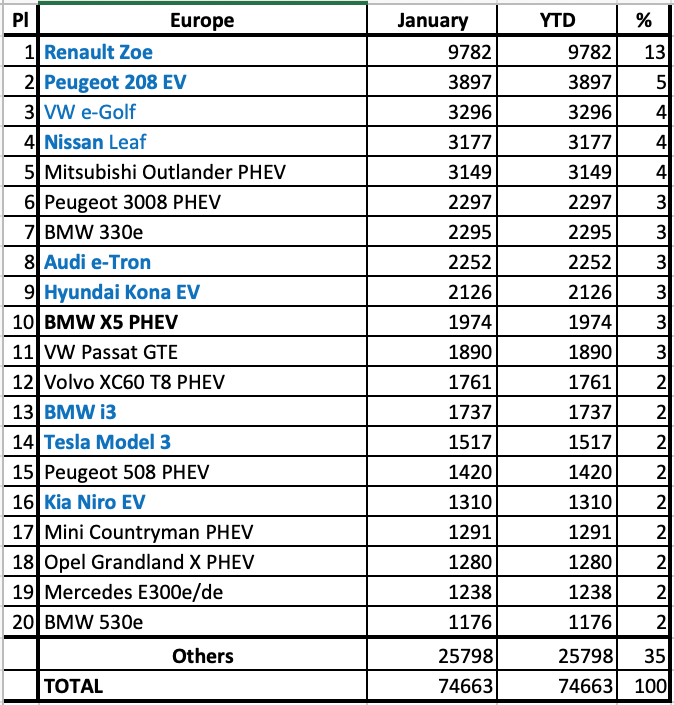 EV Sales Blog tarafından yapılan pazar araştırmasına göre Avrupa’da 2020 Ocak ayında 74.663 hibrit ya da elektrikli araç satılmış. Geçtiğimiz yıla kıyasla %121 büyüme gerçekleşirken, 2015’den bu yana elektrikli veya hibrit araç satışlarında ilk kez üç haneli rakam görüldü.