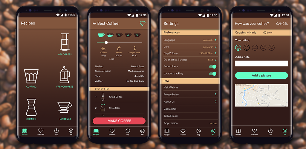 coffee.cup.guru: Ücretsiz olan bu uygulama da size çeşitli kahve yapma yöntemleri için 30 farklı tarif sunuyor. Sizin yönlendirmeleriniz sonrasında ilginç animasyonlar, bilmek isteyebileceğiniz her tarifin istatistiği ile birlikte adımlarla yönlendiriyor. Reçete değerlendirmeleri ve bir tarih bölümü, favorilerinizin neler olduğunu ve özellikle neyin iyi sonuç verdiği ipuçlarıyla, size kişisel bir veri havuzu sunması, coffee.cup.guru’yu öne çıkaran özelliklerinden.