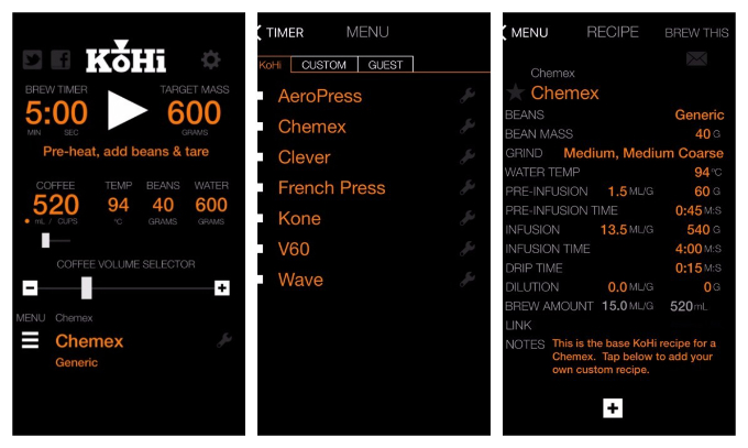 KoHi: KoHi Labs tarafından hazırlanan KoHi, profesyonel anlamda kahve yapanlar için listenin başında gelen bir uygulama. Demleme hesap makinesi, zamanlayıcı ve reçete yöneticisi gibi uygulamalarıyla ne tür bir dökme yöntemini kullandığınızı seçmenize izin veren KoHi; Chemex, French press, AeroPress, vs… şeklinde demlediğiniz kahvenizin en iyi durumda demlenmesini sağlar. Sadece ne kadar ve nasıl kahve demleneceğinizi önceden belirleyin, gerisini KoHi bir şekilde halledecektir.