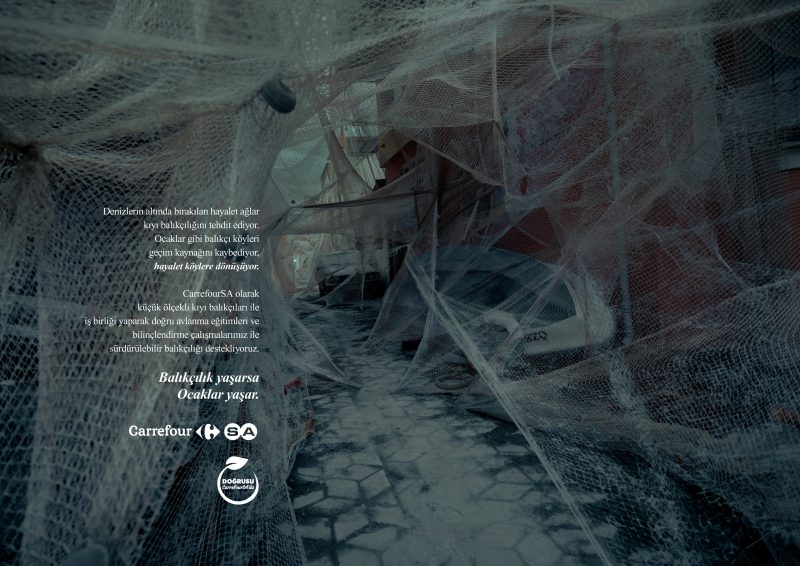 CarrefourSA’nın, “Balıkçılık Yaşarsa Ocaklar Yaşar” projesi, TBWA\Istanbul imzasıyla hazırlanan etkileyici bir enstalasyonla aktarıldı. Projeyle, yanlış avlanma sonucu denizlerin altında kalarak balıkların üremesini engelleyen hayalet ağların aslında balıkçılıkla geçinen bir köyü, hayalet bir köye çevirebileceğine dikkat çekiyor.