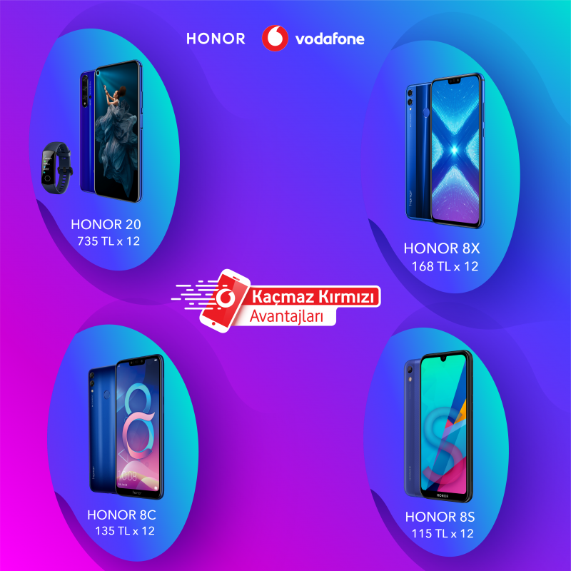 Kaçmaz Kırmızı Günleri kapsamında firmanın amiral gemisi HONOR 20, HONOR Band 5 hediyesiyle birlikte 795 TL yerine 735 TL’ye 12 ay tarifeye ek ödemelerle sadece Vodafone Online Mağaza’dan satın alınabiliyor. Damla Çentiğiyle HONOR 8S 125 TL yerine 115 TL’ye 12 aylık ek ödemelerle, ön taraftaki ikinci flaşıyla HONOR 8C 155 TL yerine 135 TL’ye 12 aylık ek ödemelerle tüm Vodafone Mağazaları’nda tüketici ile buluşurken, büyük ekranı ve çerçevesiz tasarımıyla dikkat çeken HONOR 8X 188 TL yerine 168 TL’ye 12 aylık ek ödemelerle sadece Vodafone Online Mağaza’da yer alıyor. Vodafone Online Mağaza’ya vodafone.com.tr adresinden ya da “Vodafone Yanımda” uygulamasından erişilebiliyor.