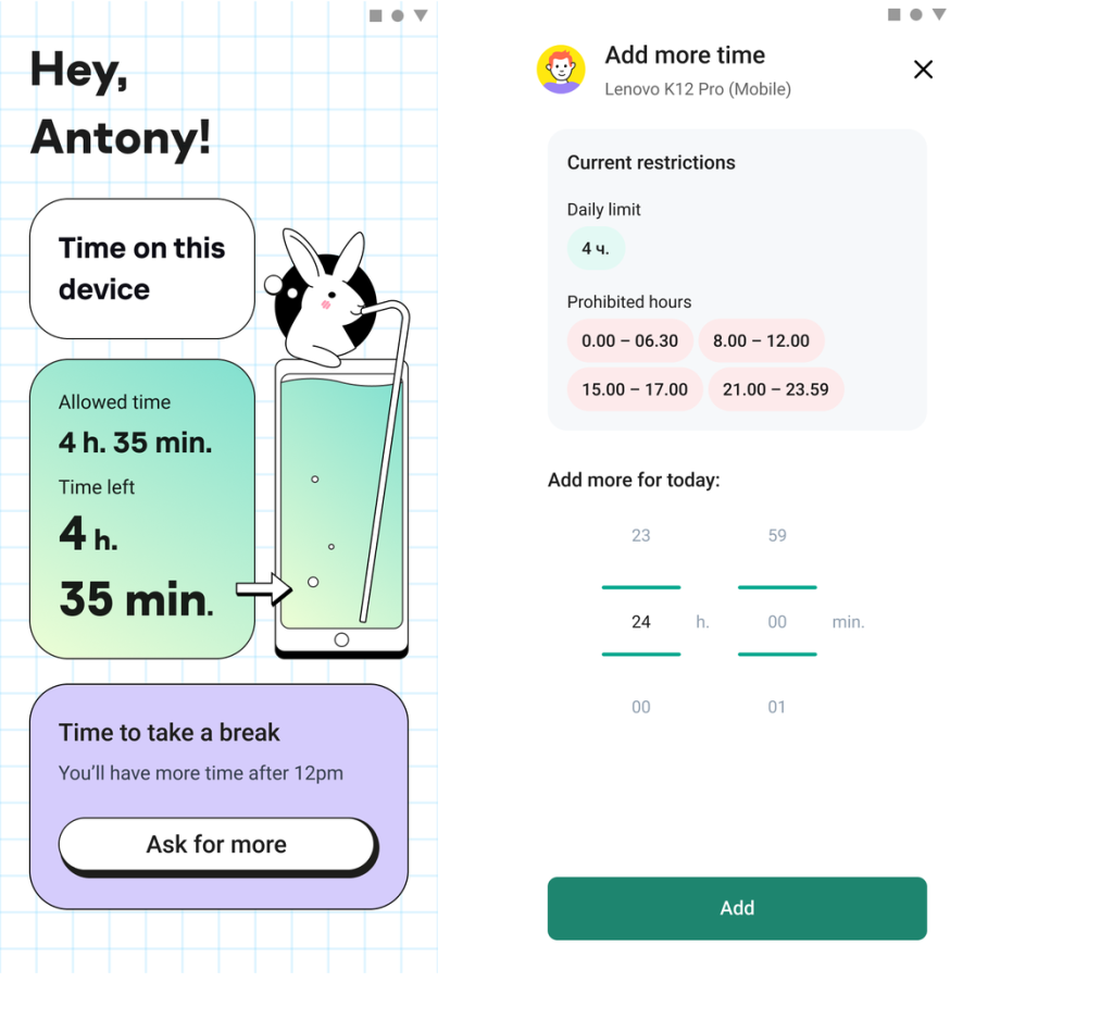 Güncellenen Kaspersky Safe Kids uygulaması ile çocuklar, uygulamanın ana ekranından ekstra cihaz süresi talep edebiliyor. Çocuk ekstra süre talep ettiğinde, ebeveynler ekranlarında bir bildirim alıyor ve bu bildirim onları ‘Talep’ bölümüne yönlendiriyor. Çocukların talep edilen süreyi belirtmelerine gerek yok, ebeveynler onlar için uygun zaman aralığını kendileri seçebiliyor. Buna ek olarak, ana ekranda ebeveynler için kullanılan ekstra süreye ilişkin istatistikleri görebilecekleri yararlı infografikler mevcut.