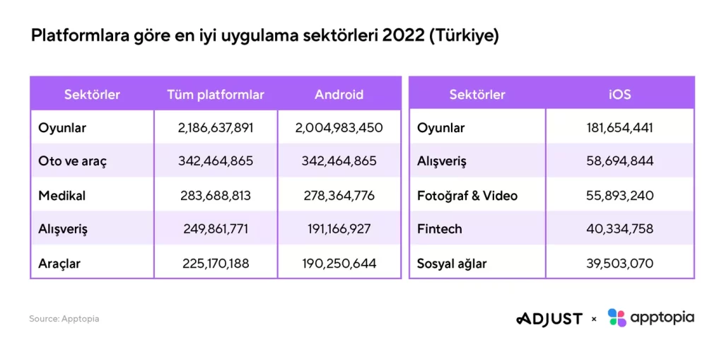 Uygulama indirmede mobil oyun açık ara önde. Ülkemizde, bütün platformlarda 2022 yılında oyunda 2.1 milyar indirme sayısına ulaşıldı. 342 milyon indirmeyle otomotiv kategorisi ikinci sırada yer aldı. Medikal uygulamalar üçüncü sırada. iOS’da ise alışveriş, fotoğraf, fintek ve sosyal ağlarda indirme öne çıktı. Genel ortalamada ise fintek, alışveriş ve sosyal ağların kullanımının yükselişte olduğu görülüyor.