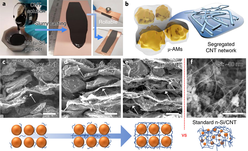Bilim insanları, enerjinin en yüksek verimlilik seviyelerinde aktarılmasını sağlayan bir karbon nanotüp ve lityum kompozitini kullanarak daha kalın ve daha verimli pil elektrotları geliştirdi. Sonuç olarak, piller hızlı bir şekilde şarj oluyor ve enerji muhafaza hacmi için potansiyeli en üst düzeye çıkıyor.