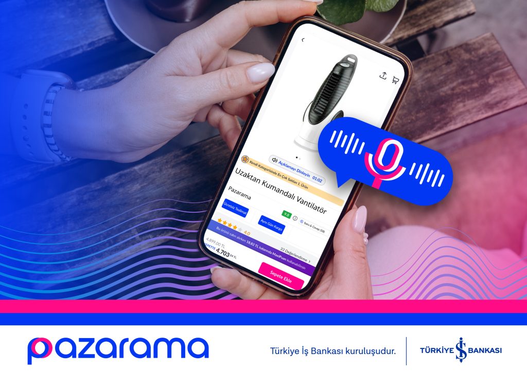 Türkiye İş Bankası’nın e-ticaret sektöründe faaliyet gösteren yerli pazaryeri Pazarama, yapay zekâ alanındaki ürün geliştirme faaliyetlerine bir yenisini ekleyerek “Sesli Ürün Özeti” özelliğini kullanıcılarla buluşturuyor. Ürünlerin ismi, kategorisi, markası, görselleri, puanları ve kullanıcı yorumları gibi tüm detaylar yapay zekâ tarafından analiz edilerek anlaşılır ve yönlendirici bir dille seslendiriliyor. Böylece kullanıcılar; ürünün temel özelliklerini ve sağlayacağı faydaları dinleyebiliyor.