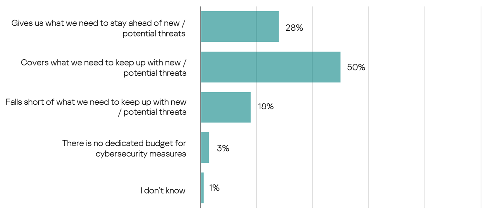 Siber güvenlik önlemleri için ayrılan bütçe sorulduğunda, dünya genelindeki katılımcıların %78’i yeni tehditlere ayak uydurabilecek ve hatta bu tehditlerin önüne geçebilecek donanıma sahip olduklarını belirtti. Ancak şirketlerin %21’i bu konuda pek iyi durumda değil ve %18’i şirketin altyapısını gerektiği gibi korumak için yeterli fona sahip olmadığını bildiriyor. Aynı zamanda, siber güvenlik için hiç maliyet ayırmayan şirketler de var. Şirketlerin %3’ü siber koruma ihtiyaçları için özel bir bütçeleri olmadığını söylüyor.