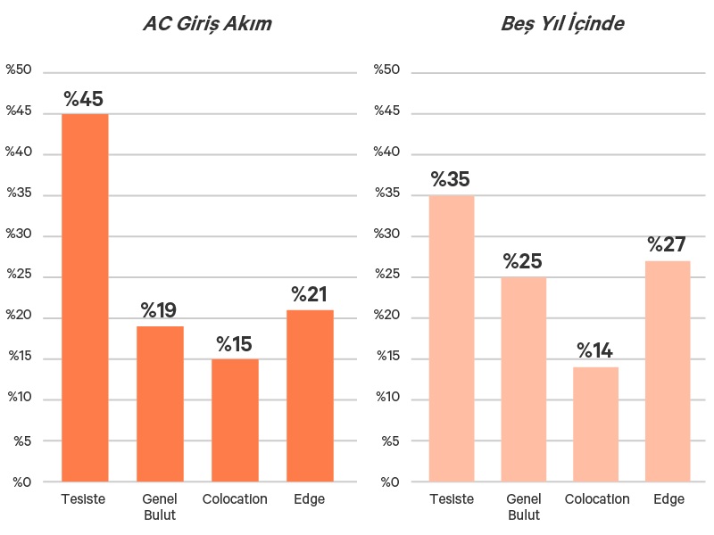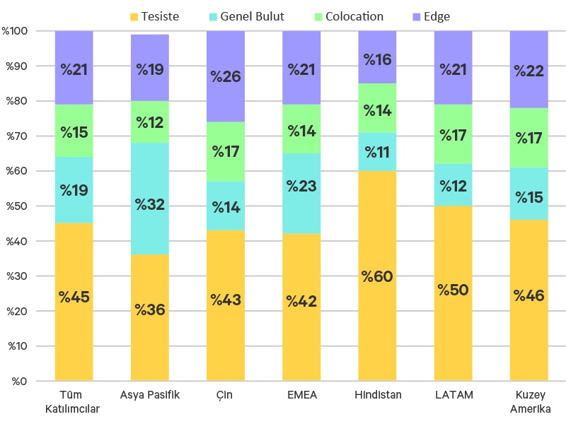 Ankete katılanların yaklaşık 3’te 1’i (yüzde 34) ya büyük bir edge dağıtımının ortasında ya planlama aşamasında. 4’te 1’i de yeni, amaca yönelik edge siteler kurdu, yüzde 41 ise halihazırda var olan eski edge siteleri işletiyor. Edge’deki tüm aktiviteler ilgi çekici ancak anket katılımcıları ayrıca ana sitelerde aktivitelerde yüzde 150’lik bir artış öngörürken, bulut etkinliklerinin de artmasını bekliyor. Ankete göre, genel bulutta dağıtılan BT kaynaklarının bugün yüzde 19 olan yüzdesinin 2026 yılına kadar yüzde 25’e çıkacağı tahmin ediliyor. Bilgi işlem kaynaklarına olan talep bugünün ağlarında hızla artıyor.